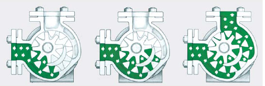 高粘度泵是内齿轮泵回转式正位移泵,液体流动由两个齿轮产生,主动齿轮和从动轮,内齿轮嵌在外齿轮里面,由一个月牙挡板隔开。当齿轮转动时,液体被吸入到两个齿轮和月牙挡板围成的空间里,当齿轮啮合时,液体受压被排除泵外。因此,液体流动平稳,并且容量大,结构紧凑。
