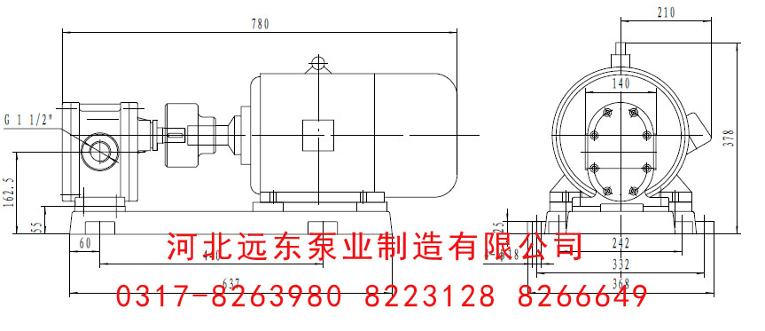 2CY7.5齿轮泵配7.5kw-4电机安装尺寸图,该泵流量7.5m3/h,压力2.5Mpa,口径G1 1/2",泵效率63%,机座号132M.